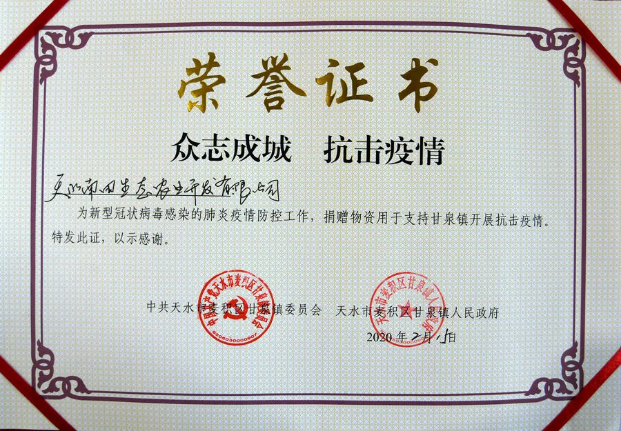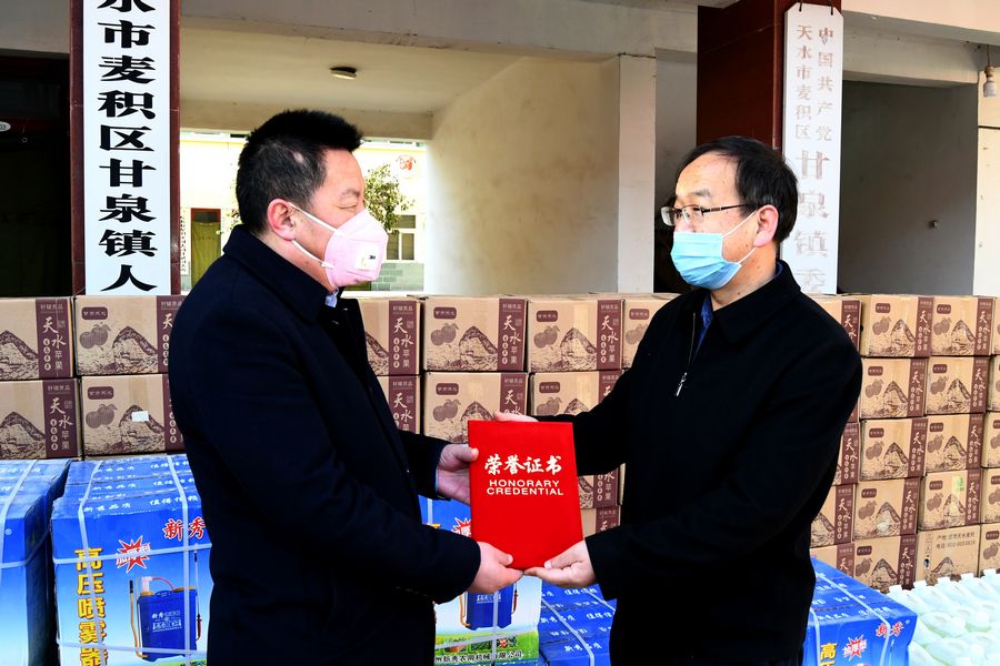 捐赠结束后,甘泉镇党委负责人向爱心企业颁发了新冠状肺炎疫情防控物资捐赠证书,以示谢意!
