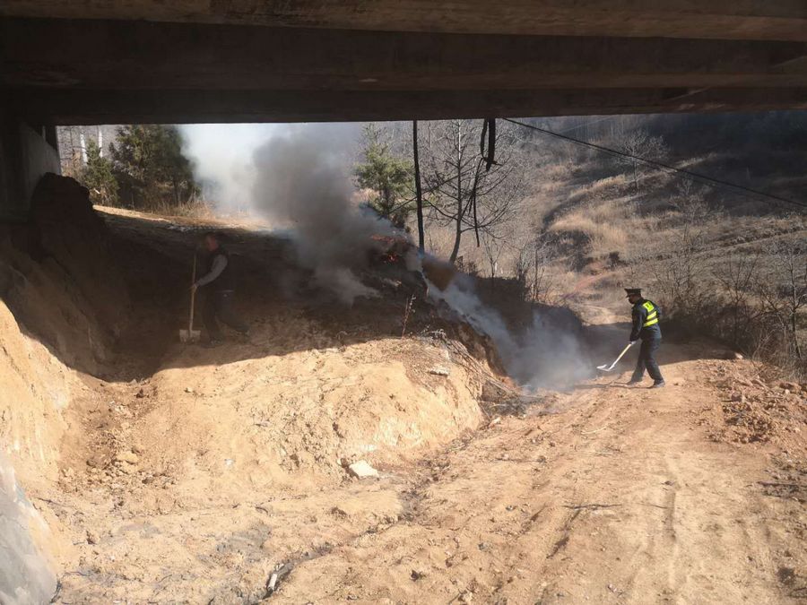此火情系附近的农民擅自点燃柴草所致,接到火情电话的大队长张小平带领内业管理相关执法人员及时赶到带领执法人员用铁锹铲土覆盖着火区域以防死灰复燃,同时对在村民擅自纵火会造成后果进行了严厉批评,并对在场的其他村民进行了高速公路辖区防火安全教育。