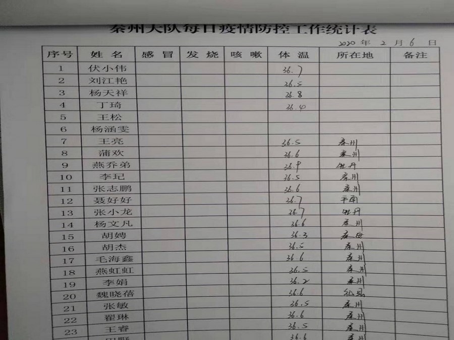 一、落实管控措施。大队每天坚持科学、严谨、有序地开展疫情防控、监测工作,严格落实“出入登记、体温测量、安全防护、每日消毒、舆情管控”五个重要环节,严格细致筛查出入营区的人员、车辆,对外来人员一律禁止进入营区,对出入车辆一律消毒处理。组织专人对全体指战员每日进行不少于2次体温测量,对营区进行不少于2次的全面消毒,安排专人监控涉消舆情,及时上报疫情防控信息,教育广大指战员不信谣、不传谣。