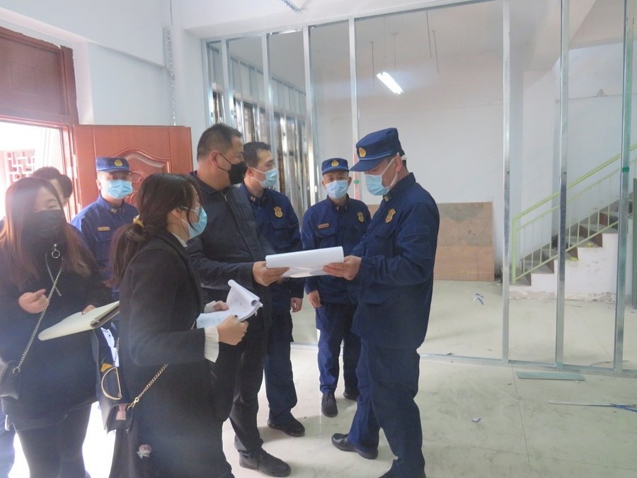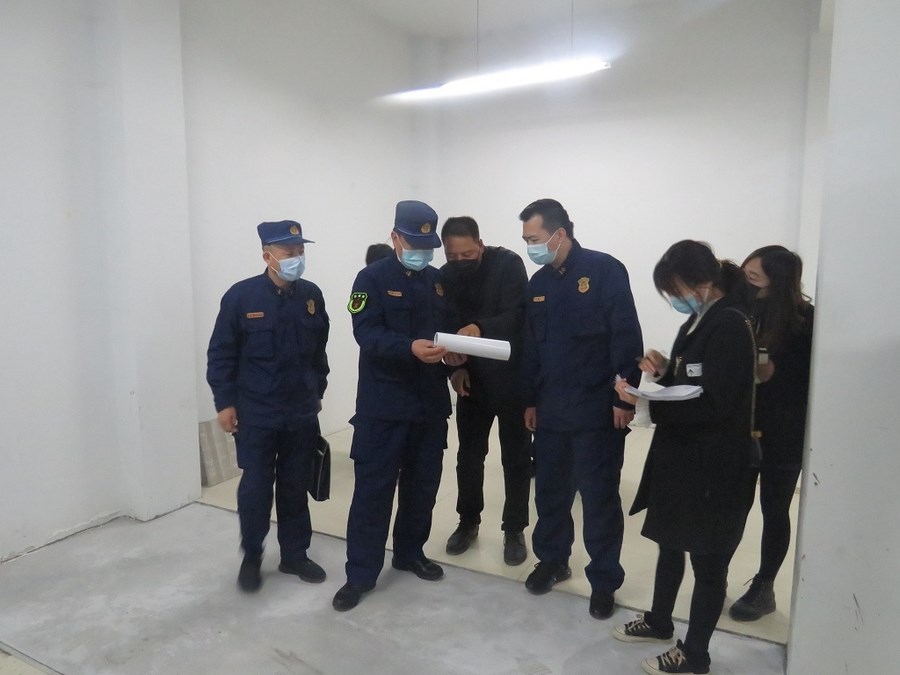 政委李延奇一行在设计工程负责人的陪同下,首先听取了设计人员对秦州大队消防科普教育馆的设计建设,并对内部结构进行了查看。随后对照建设标准,就消防知识展示、火场逃生自救模拟演示的设置进行了查看,并逐一根据设计图纸对消防器材展示区、消防VR体验区、消防服展示区、绳结训练区、模拟灭火体验区展示功能区,如何设置,如何改造,如何开展演示等可行性,与设计人员进行了沟通、商讨,提出了建议和修改意见,与设计人员达成了一致共识。