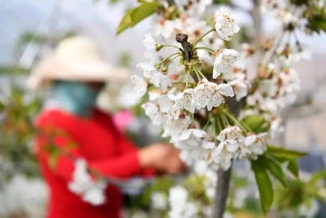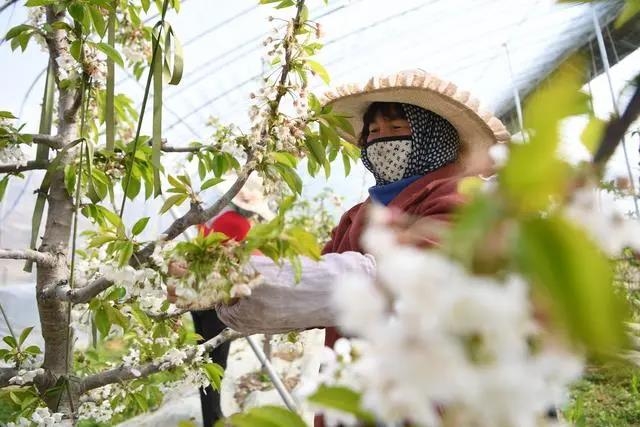 3月13日,甘肃省天水市秦州区杨家寺镇郑宋村农民在天水大丰农业发展有限公司的樱桃种植大棚内进行田间管理。