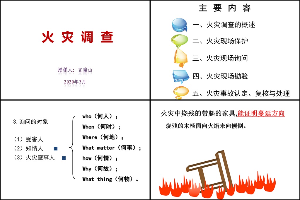 此次培训,由甘谷县消防救援大队教导员支瑞山授课。重点讲解了火灾事故调查中普遍存在的一些疑难问题,对火灾现场保护,火灾现场询问,火灾事故认定、复核与处理及火灾现场勘验进行了规范讲解。授课人员结合实际对授课内容进行了阐述,增强了消防监督干部组织火灾调查的能力。