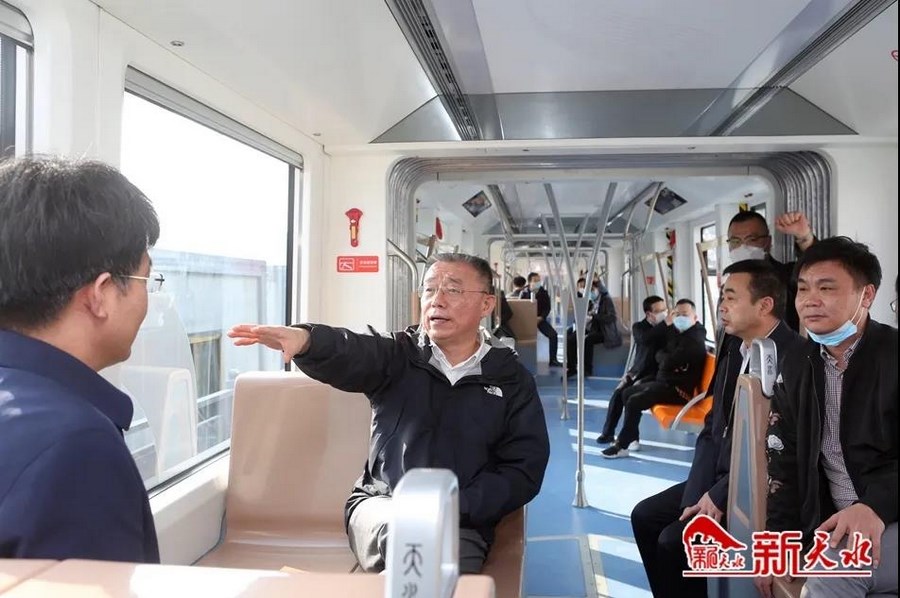 王锐从秦州区五里铺站搭乘有轨电车,在麦积区埠北路站下车,一路详细了解了有轨电车车厢内部设施、运营筹备及沿线附属设施建设等相关情况。