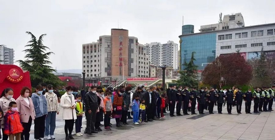 清晨的秦州区龙城广场庄严肃穆,广场上的国旗下半旗志哀。当防空警报响起时,广场和周边道路上的市民面向国旗,在肃穆的气氛中向新冠肺炎疫情牺牲烈士和逝世同胞默哀3分钟。