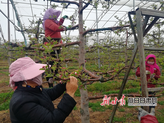 在天水市麦积区花牛镇廿铺村的南山坪万亩花牛苹果示范园区里,工人们正在花红叶绿的果林里开展“人工疏花”,为花朵定型,为春华秋实打下坚固的“伏笔”。