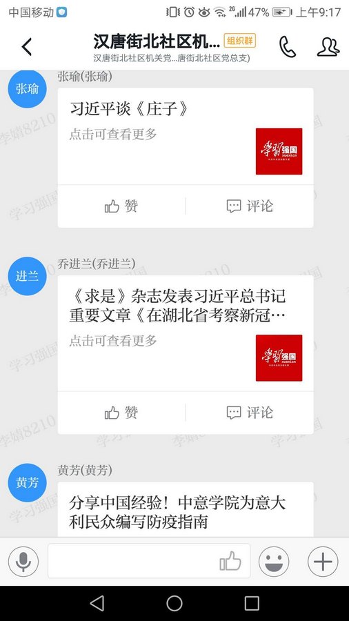 自“学习强国”学习平台上线以来,汉唐街北社区党总支迅速按要求建立学习组织,动员指导全体党员干部下载安装“学习强国”APP。