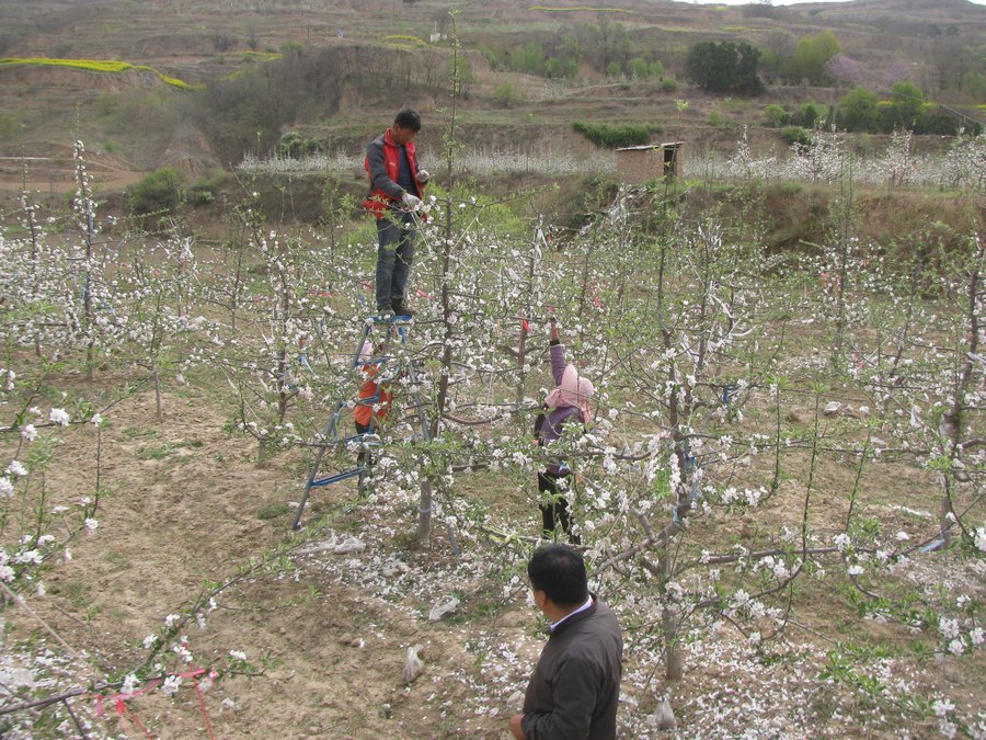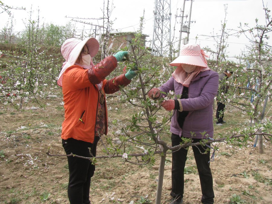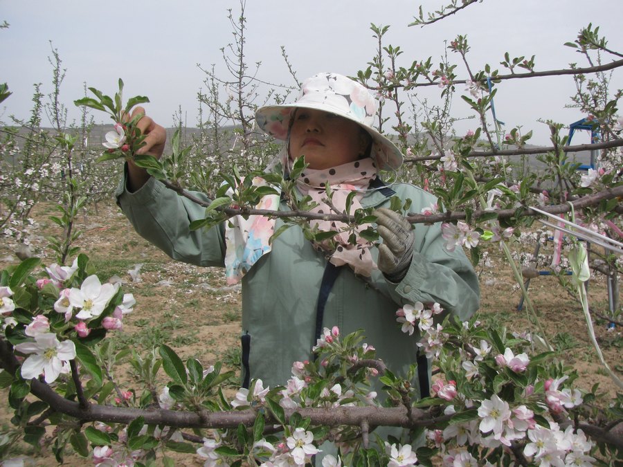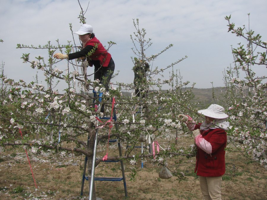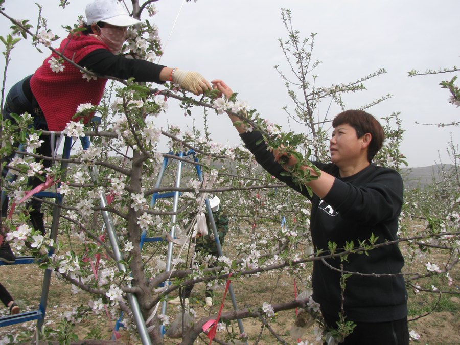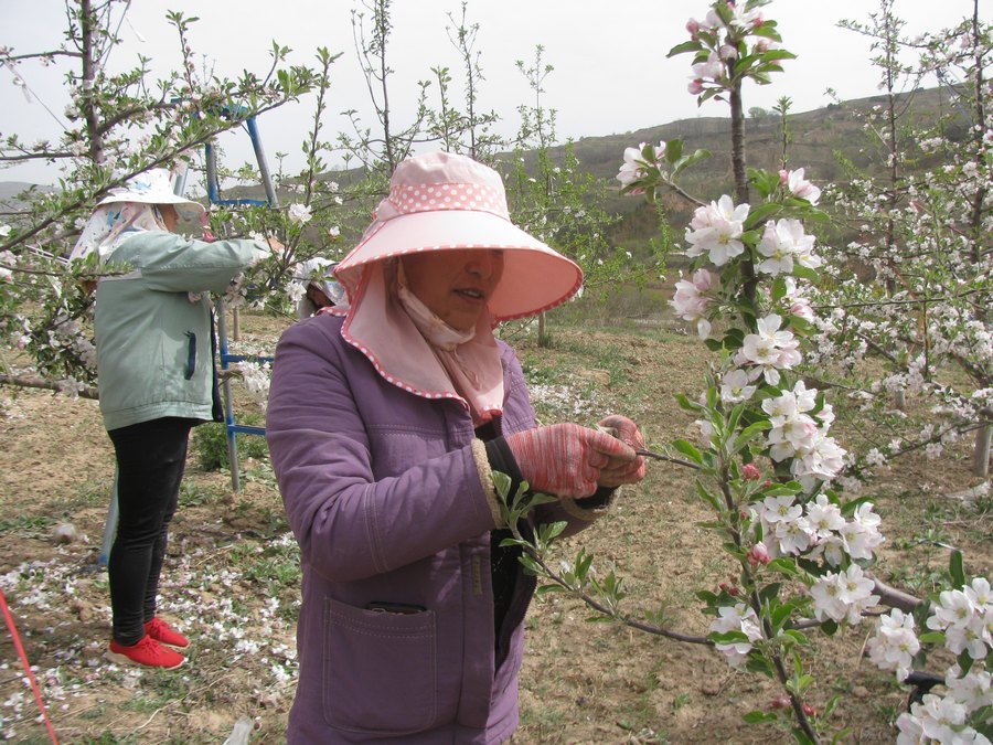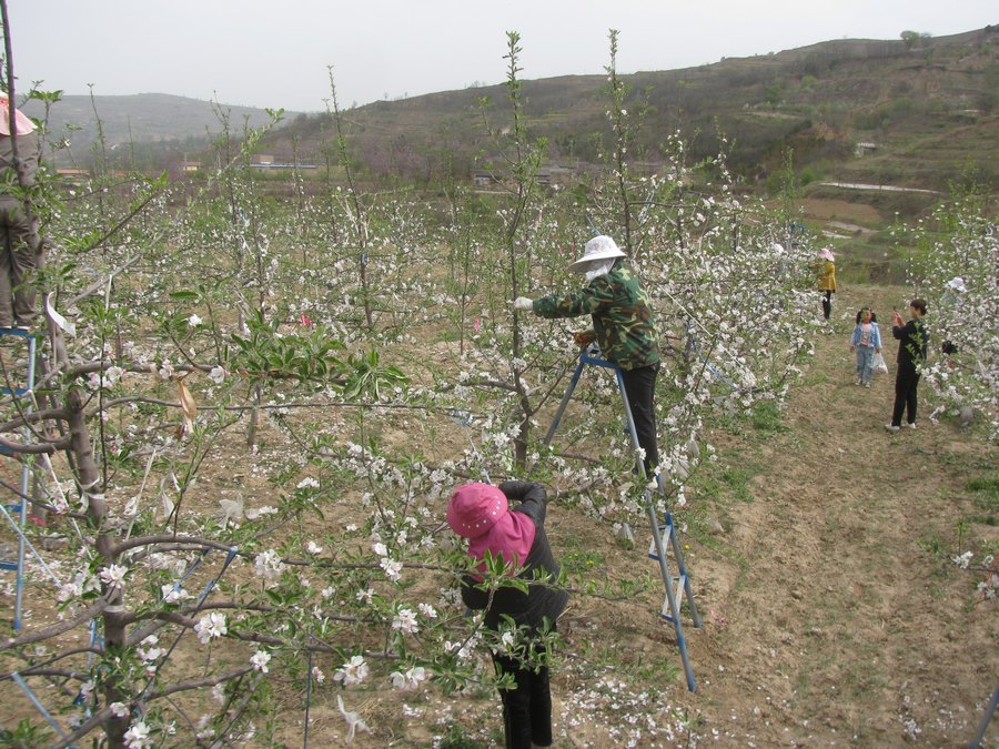 三五成群的妇女们给苹果疏花,为来年苹果大丰收打下了良好的基础。