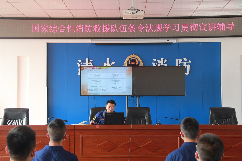 授课中,副站长郭凌云同志首先从制定依据、必要性和主要原则三个方面对国家综合性消防救援队伍《内务条令(试行)》、《队列条令(试行)》、《基层建设纲要(试行)进行详细解读,并通过新老条令对比学习,使全体指战员充分认识到学习新条令纲要的重要性,进一步增强责任感和使命感。随后,对指战员在学习贯彻过程中出现的疑难问题进行解答,并通过随机提问检查掌握情况,通过讨论交流的形式引导指战员深入思考,深化认识,确保条令纲要内化于心。最后,突出重点,有针对性的开展模块化授课,讲清“两条令一纲要”的科学内涵和精神实质,要求全体指战员严肃对待,做好笔记,并结合实际将理论知识运用到日常执勤备战中,确保条令纲要外化于行。