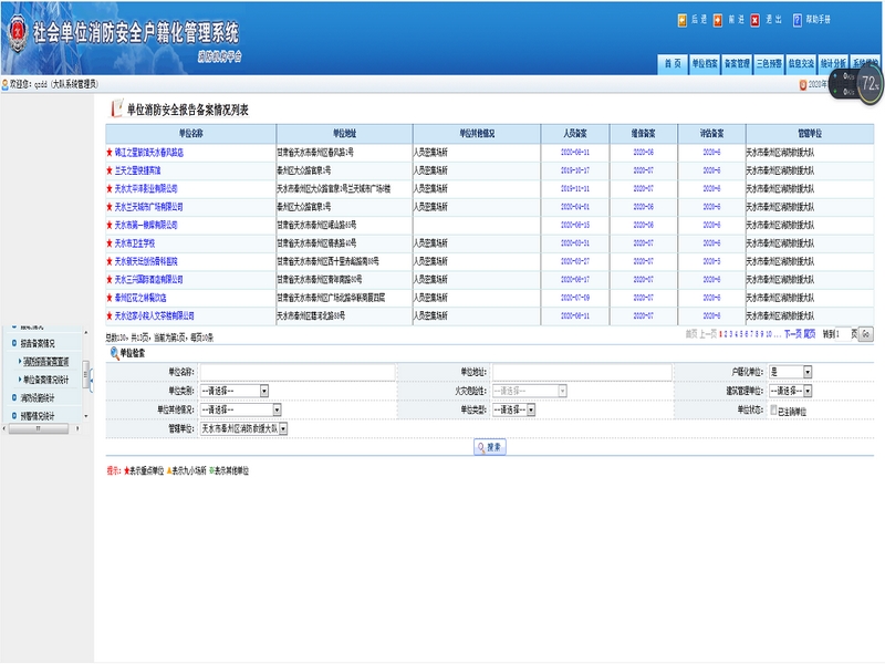 消防安全备案到位。大队将消防安全重点单位的消防安全概况、建筑消防设施维护管理、教育培训、疏散演练等日常消防管理情况分类、分项录入系统,实现了消防安全管理人履职、消防设施维护保养、消防安全自我评估三项备案。通过系统,消防安全重点单位和消防部门能便捷的实现信息的录入查询、实时统计、考核培训等功能,为消防监督管理提供重要参考、证据,大大提高了管理效率。实现“四个能力”的全面铺开。