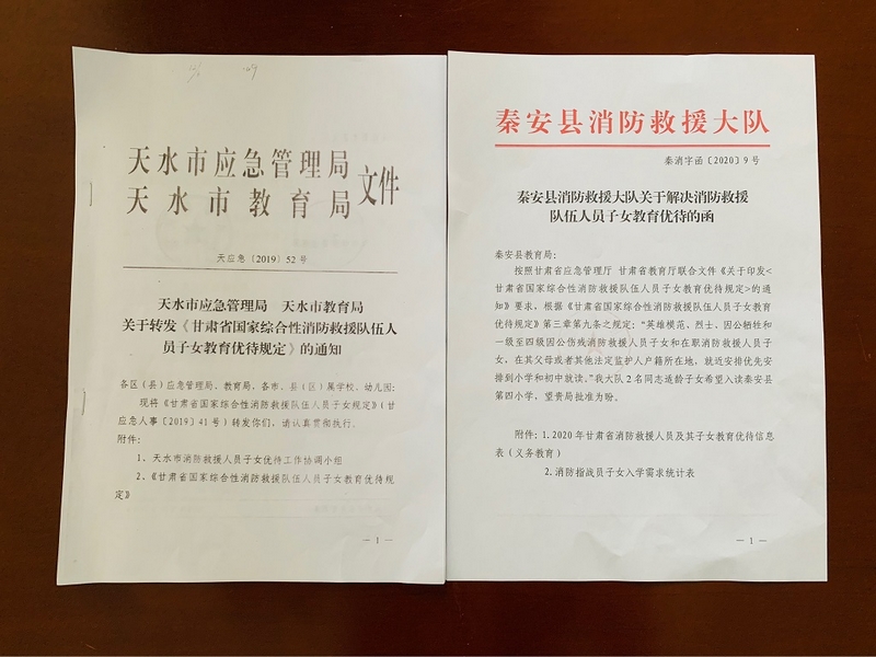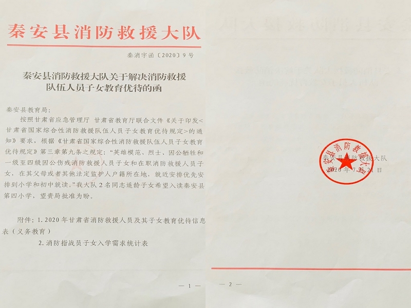 在新学期来临之前,为全力做好消防救援人员子女教育优待工作,切实让大队党支部为全体指战员、文员办实事措施落地见效,在积极落实省、市两级教育厅、应急管理厅关于《甘肃省国家综合性消防救援队伍人员子女教育优待规定》的基础上,大队党支部积极争取,与秦安县教育部门提前协调对接,确保相关问题及时解决,为大队消防救援人员子女入学创造了优质条件。