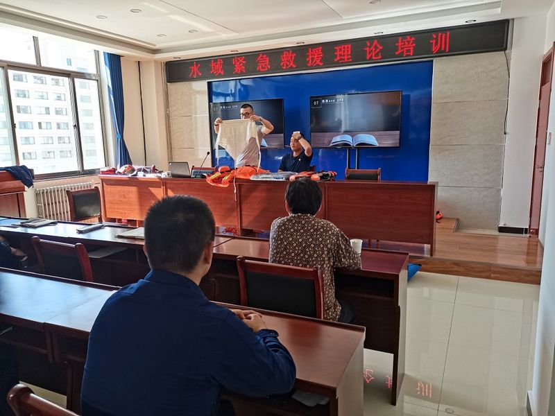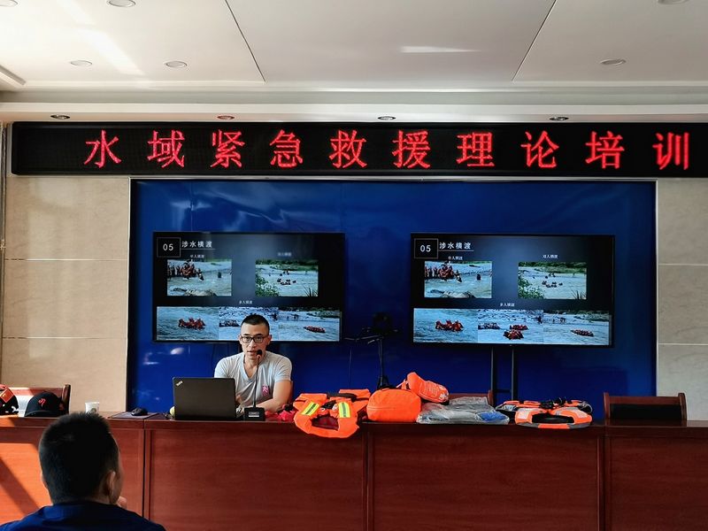 此次培训主要采取课堂授课、现场演示等形式进行,内容涵盖个人装备讲解、救援人员入水法、救援泳姿、抛绳救援、活饵救援、涉水横渡、船体救援、急救知识等水域救援理论知识。