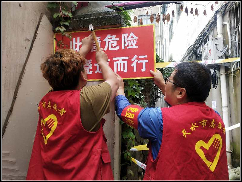 “光明行”志愿者队伍走进因暴雨受灾的院落,为他们带去关爱和欢乐。蒲家大院在暴雨中,致使外墙坍塌、院里积水,志愿者第一时间赶到劝阻居民搬离房屋,整理院落、清理积水;了解到社区低保人员所租住房屋漏水严重,致使无法居住,志愿者联系街道为其争取救助,帮助度过难关。