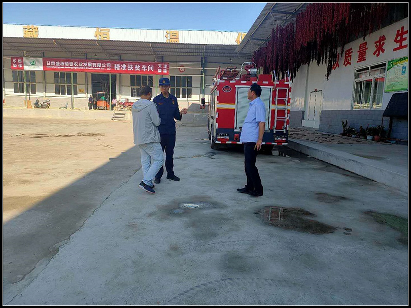 实地检查,上门服务。大队在改进监管方式的基础上,提高精准时效性,本着少而精、立足解决问题的原则,消防监督员主动上门讲解消防安全知识,排除消防安全隐患,提示消防安全重点事项,助力企业安全复工复产。9月1日,大队深入辖区甘肃盛源菊香农业发展有限公司提供上门消防安全服务,消防监督人员对复工复查企业的生产线、厂房、办公楼等场所逐一展开细致检查。针对检查发现的问题,为企业提出整改意见,帮助企业完善灭火应急疏散预案,指导企业有效开展防火安全自检自查自改,落实安全管理措施,确保企业安全生产、平稳运营。