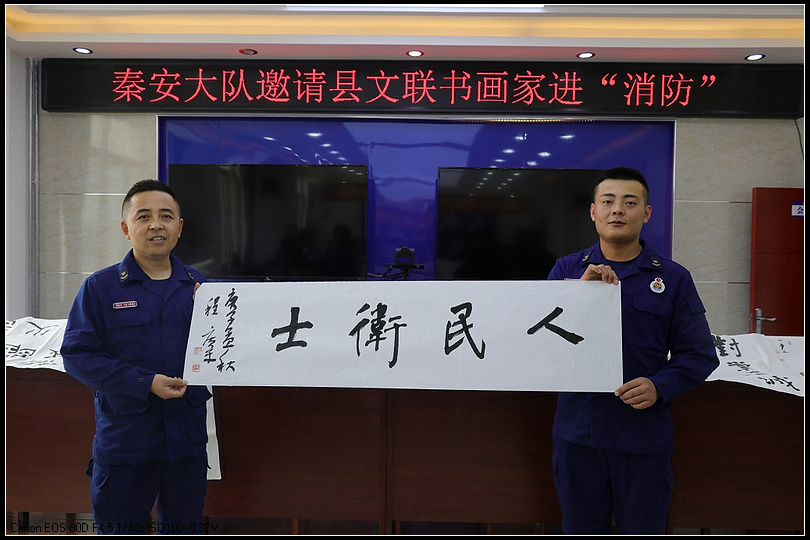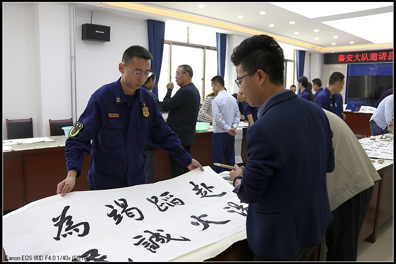 随后,艺术家们根据自身所长,挥毫泼墨,以笔墨寄心意,以字画抒真情。随着笔锋的翻飞转动,一幅幅体现消防主题和格调高雅的书画佳作跃然纸上,书画家们行云流水的手法,大气潘博、豪情万丈的气概,博得了在场队员们的连连称赞和佩服之情。最后,大队长马志东同志代表全体人员对书画进消防的艺术家们表示衷心的感谢。他表示,大队将倍加珍惜与各位艺术家们的深厚友谊,将这些书法作品好好珍藏,今后也希望县文联多来开展举办书画培训。