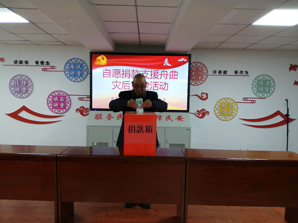 东关苑社区社会组织联合党支部93岁老党员赵诂文说:“舟曲的灾情始终牵动着我的心,作为一名老党员,我也想尽一点我的微薄之力,和我们身边的党员共同助力舟曲灾后重建。”
