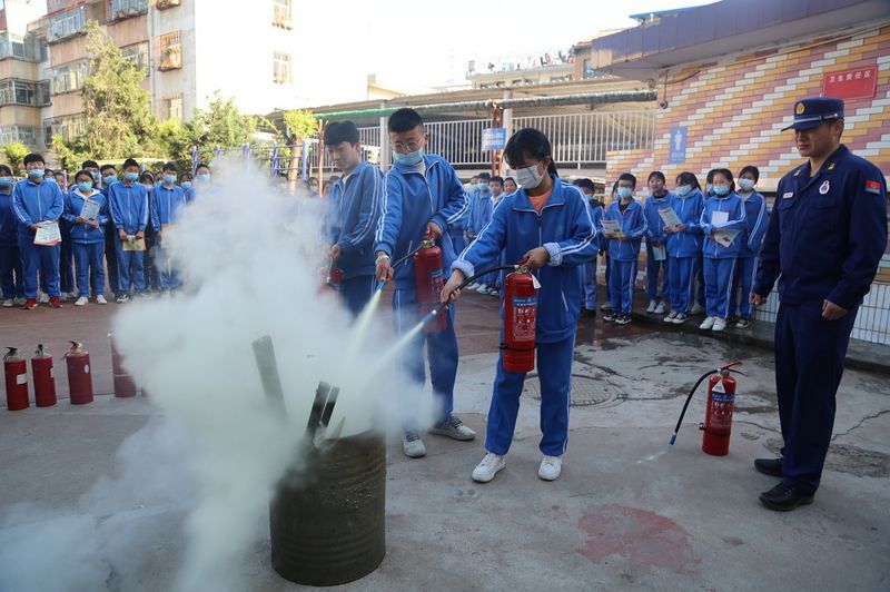理论授课期间,大队宣讲员针对校园普遍存在的消防安全隐患进行详细剖析和讲解,结合实际火灾案例和风趣幽默的语言介绍了火灾的危害、正确报火警、消防标志、初期火灾扑救的重要性和火灾逃生的方法等消防安全知识,让师生们更加深刻的认识到火灾的危害性以及预防火灾的重要性。实践教学中,大队宣讲员组织开展火场逃生疏散演练活动,随着一阵急促的警报声响起,学生们在老师的带领下,用手捂住口鼻,弯腰低头,穿过走到楼梯,按照疏散逃生路线,在老师的引导下快速有序的疏散至操场安全区域。最后,在灭火体验环节,大队宣讲员向师生展示了火灾如何扑灭,并现场演示了如何正确使用灭火器,学生们认真聆听并进行了实操体验,在实践中进一步深化消防安全意识。