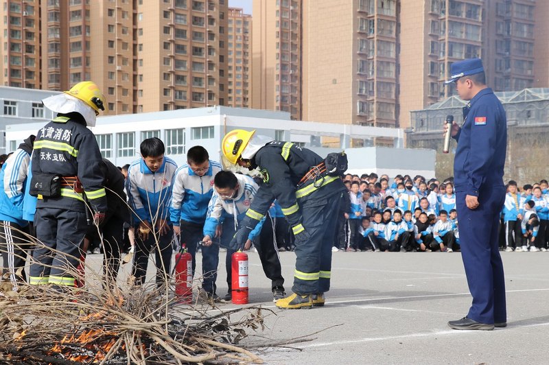 培训演练过程中,大队宣传人员围绕校园消防安全,按照“会报警、会疏散、小火会用灭火器、大火会用消火栓”的要求,向师生们介绍了发生火灾时如何报警、初期火灾扑救方法、火场逃生常识和自救过程中的紧急注意事项以及家庭防火等消防安全知识,并现场演示了灭火器的使用方法,师生代表亲自上阵,在宣传人员的指导下体验灭火的操作技巧。随后,学生们在消防指战员及学校老师的引导下展了疏散逃生演练活动。在的专业指挥下,学生开始疏散逃生,用衣袖、手帕捂着口鼻,弯腰低姿,跟随疏散引导员按照逃生路线快速有序撤离至安全地带,灭火及疏散逃生演练活动达到预期效果。