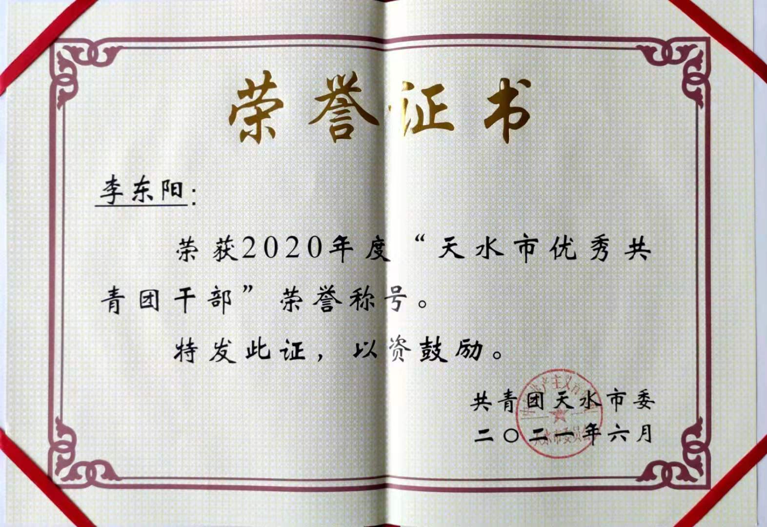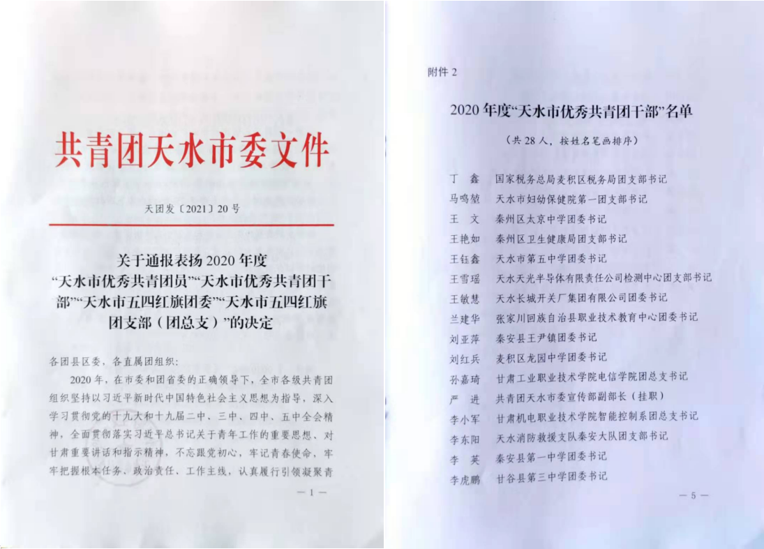近日,共青团天水市委对2020年度天水市表现突出的基层团组织及先进个人进行评选表彰,决定授予武山县消防救援大队团支部“天水市五四红旗团支部”称号,评选秦安大队成纪消防救援站团支部书记李东阳为“天水市优秀共青团干部”。