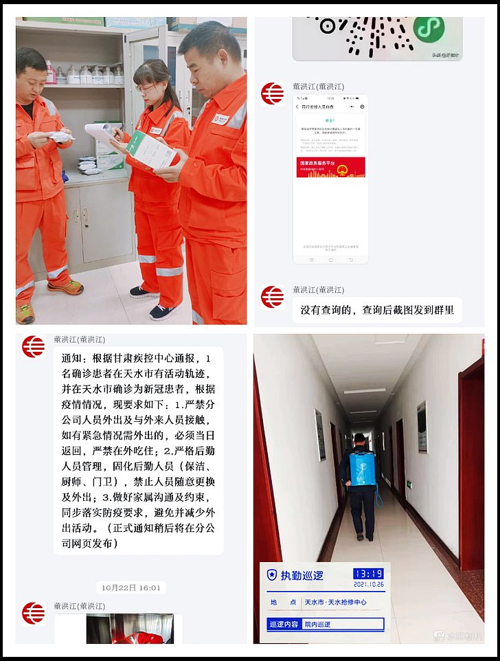 天水抢修中心按照当地政府疫情防控要求,采取微信、电话、钉钉等有效平台,抓实员工安全思想教育,强化员工的安全责任意识。暂缓员工休假,推迟休假人员回单位,做好在岗员工值班安排,加强员工进出管理制度。同时开展自查个人与家属行程轨迹,并执行每日楼道消毒 ,严控员工外出,落实外来人员的防疫消毒工作,做到安全生产和疫情防控“两手抓,两手硬”的好局面,积极同当地政府一起打赢疫情防控狙击战。