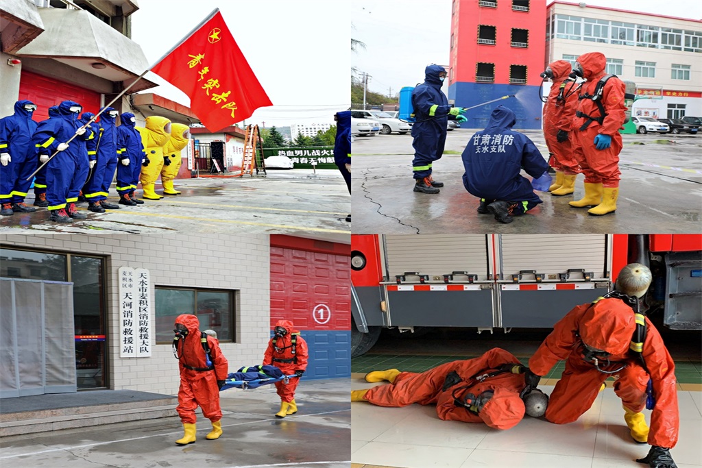 天水郡消防救援站、七里墩消防救援站:组织开展疫情防控应急处置专项训练。期间,按照“发布命令,整装集结,报告情况,清点装备,科目训练,总结讲评”的程序组织实施。对涉疫场所灭火救援及防疫应急处置行动有关内容进行学习,细化操法行动流程,讲解防疫防护设备器材的种类、性能参数、使用方法和注意事项。对洗消药剂、防化服、车辆配备的防护口罩情况进行了检查,对洗消车辆、单兵洗消帐篷、简易喷淋器架设是否完整好用进行了测试,对消防车搭建洗消通道、拉梯搭建简易洗消点、水幕水带洗消消防车以及搭建简易洗消站科目进行训练。参训人员通过设置警戒区、搭建洗消帐篷、架设洗消流水线、建立污水排水收集系统、对人员和装备分别进行洗消等一系列科学规范洗消程序,训练过程中,各级指战员严格按照规范流程执行,严格遵守疫情处置应急操作规程,分工明确,反应迅速,配合默契,做到了有条不紊,安全高效。