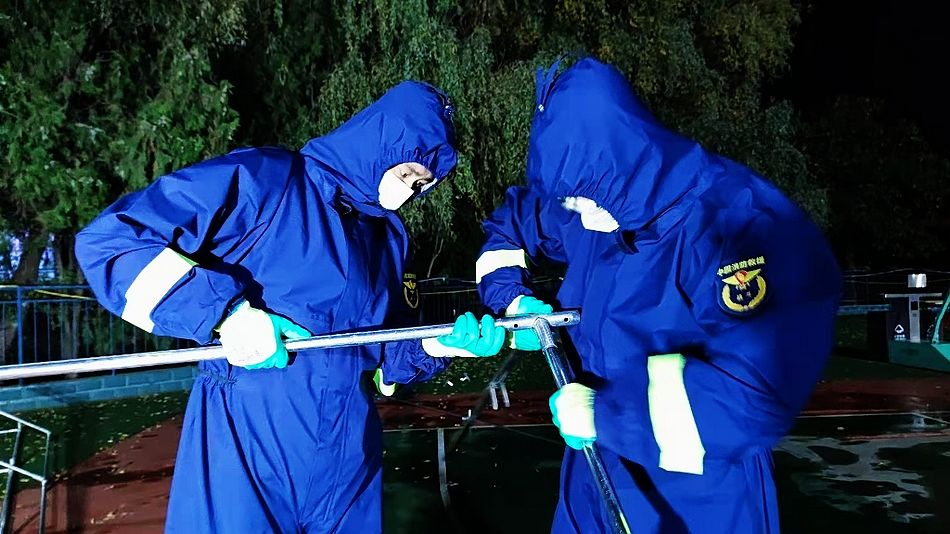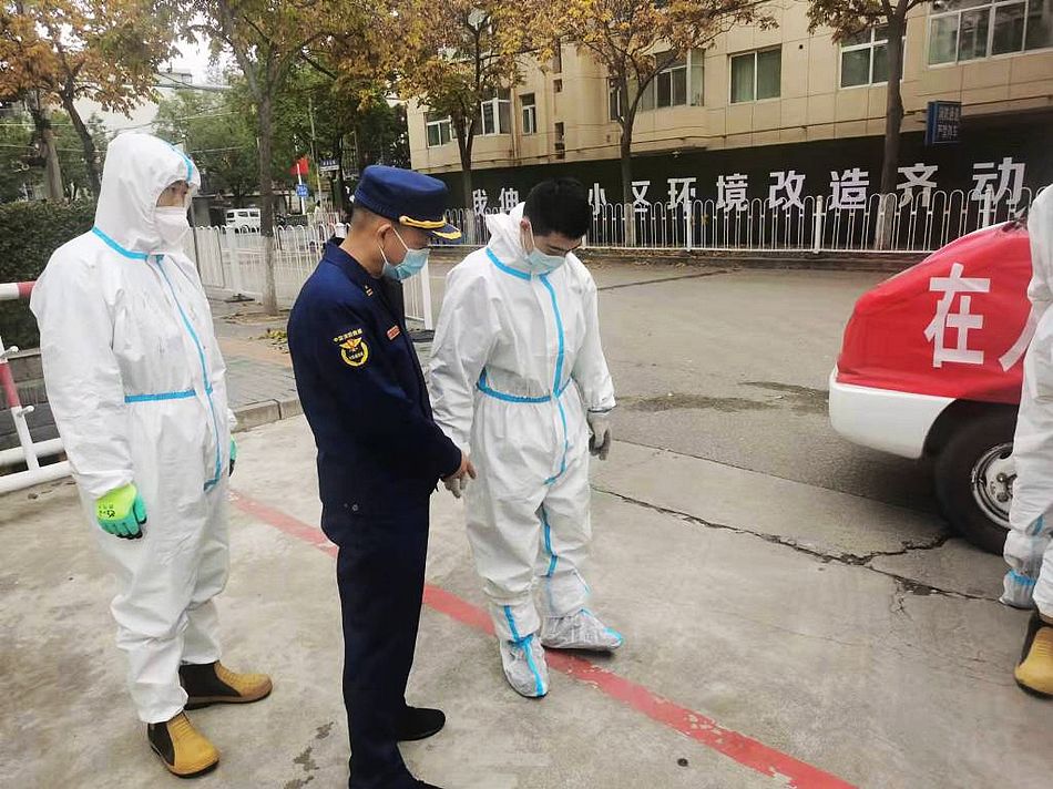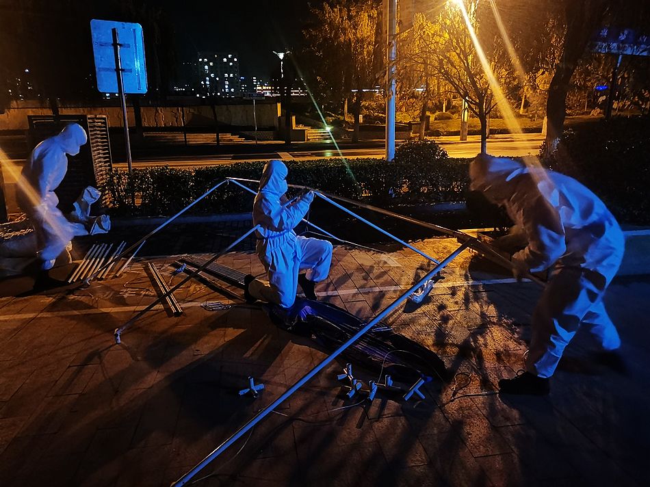 在危难中显示出担当,在疫情防控第一线践行初心使命。大队立即调派3辆消防车、36名指战员迅速投入战斗。按照疫情防控指挥部的指示,大队将党员突击队分成3个小组,每名队员均严格落实个人防护措施,全程佩戴穿着全封闭式医用防护服,并严格落实穿戴消杀规程,每个小组均指定一名干部带队负责。第1小组为物资转运组,第2小组为消杀组,第3小组为帐篷搭建组。转运组历时3个多小时将酒精、消毒液、医用防护服、核酸采样箱等物资运送并搬运到指定位置后便马不停蹄的赶往下一个物资储存点,队员们衔接有序、有条不紊,连夜奋战9个多小时,将420余件帐篷卸载并运送到制定位置,为疫情防控工作有序开展争取到了宝贵时间。在运送及搬运过程中,第2小组对东岔镇、三岔镇进行地毯式消杀,对镇街道、隔离点、学校等重点场所区域,持续了8个多小时持续喷洒消毒杀菌处理,消杀面积达2万余平米。并对做好疫情防控的相关知识与政策进行了宣传。同样,第3小组也是在争分夺秒、不分昼夜的在各点搭建帐篷,11月的夜里已很是寒冷,但指战员们各个汗流浃背,他们是在与时间赛跑,与疫情抗争。他们知道,早一点搭好一顶帐篷,就能多检测出一批核酸样本。终于历经二十多个小时的鏖战,在区主要街道、路口,小区门口共搭建起近100余顶帐篷,截至目前,搭建工作还在紧张的进行中。同时,大队志愿者服务队,按照轮流换班形式,对包抓小区进行24小时值守,严防人员进出、流动和聚集。守好广大人民群众防控疫情的重要关卡。“火焰蓝”的身影穿梭在大街小巷、街道社区、居民小区,形成了一道亮丽的风景。