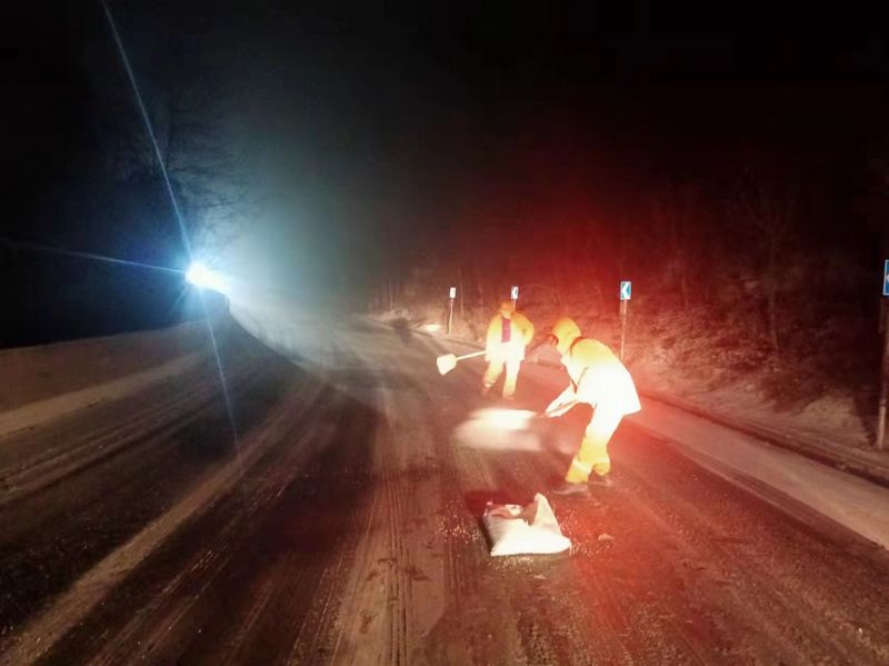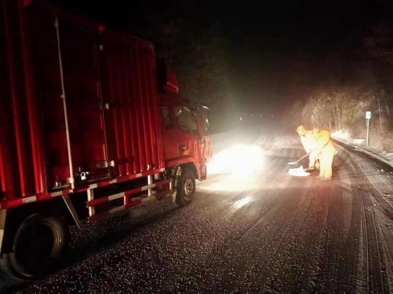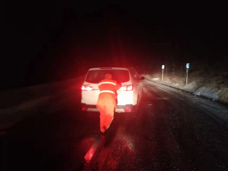 下午4时左右,天水市秦州区境内开始普降小雪,G316线稍子坡路段,由于海拔高,气温较低,路面出现结冰情况,不具备通行条件,该段以雪为令,迅速组织养管站人员、机械开展除雪防滑,全力保障公路安全畅通。随着夜晚气温逐渐下降,在爬坡路段,部分车辆因为没有配备防滑链轮胎打滑,车辆无法正常通行,为尽快帮助司乘人员尽快脱离险境,防止该路段出现拥堵情况。该段养护人员不畏严寒,在爬坡路段撒上融雪剂、防滑料,找来麻袋垫在受困车辆车轮下方,喊着号子用人力一个一个把受困车辆推上坡,经过近一个小时的努力,成功帮助受困司乘人员脱离困境。 司机师傅纷纷表示感谢,“没想到这么晚,你们还有人过来帮忙,真是太感谢了!”