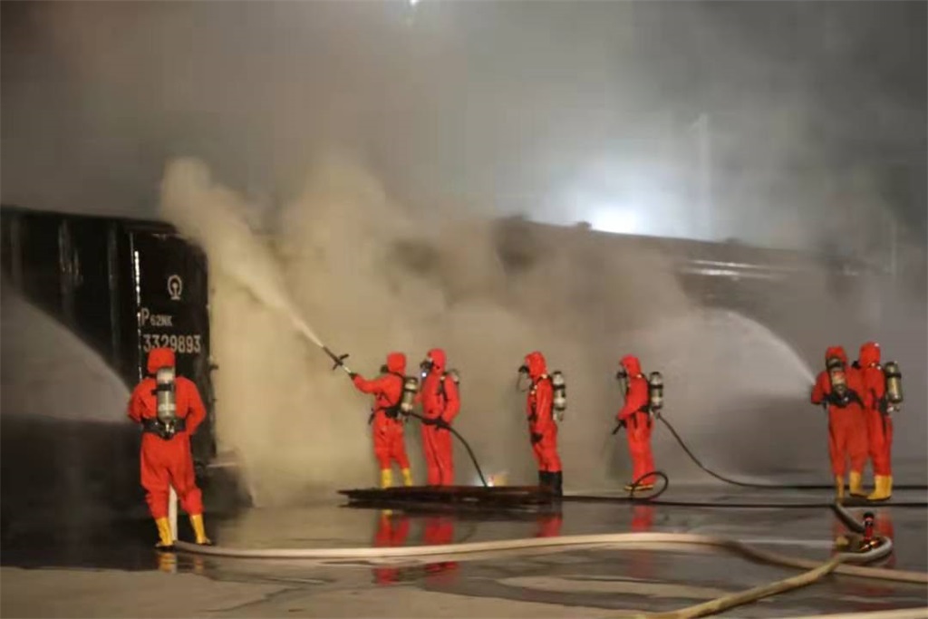 2021年11月5日16时30分,天水市119指挥中心接到报警称:一辆从乌鲁木齐开往上海的货运火车行驶至麦积区下曲湾直通厂路段时,一节拉载61吨精对苯二甲酸的车厢起火,情况紧急。支队指挥中立即调派麦积区天河消防救援站4车23人赶赴现场,同时调派新华路特勤站3车20人、二十里铺站2车18人增援处置,支队长牛小强带领支队全勤指挥部遂行出动。17时20分,消防救援力量陆续到达现场,与站内货运、铁路等各方工作人员配合,划定警戒和安全区域,并设置安全观察哨,分区段进行记录、安全瞭望和环境监测。因车厢封闭火情不明,由于起火路段轨道错综复杂,担心火势扩大影响铁路线路的正常运行,同时保证消防救援人员安全,经与麦积区货运部门协商后,将事故车辆停靠货运大厦内安全区域实施处置。火车车厢分离驶入货运场后,在技术人员的操作下将火车头和车厢分离,消防员利用干粉枪对车厢外部明火进行压制,扑灭可见的着火点,同时对车厢降温。车厢外部的火势虽完全被压制住,但车厢内部仍有阴燃,在水枪掩护下消防员配合铁路技术人员,成功将起火车厢门打开,开门的一瞬间有大量白色烟雾喷涌而出,堆满货物的厢体又迅速窜起明火,消防员利用干粉枪对车厢内火势进行扑救处置,并对车厢继续进行冷却,近3个小时的扑救中,在全勤指挥部的正确指挥下,经过所有消防员的紧张救援,火场温度明显下降,火势被完全控制。此次事故救援圆满结束,成功避免了重大事故的发生。