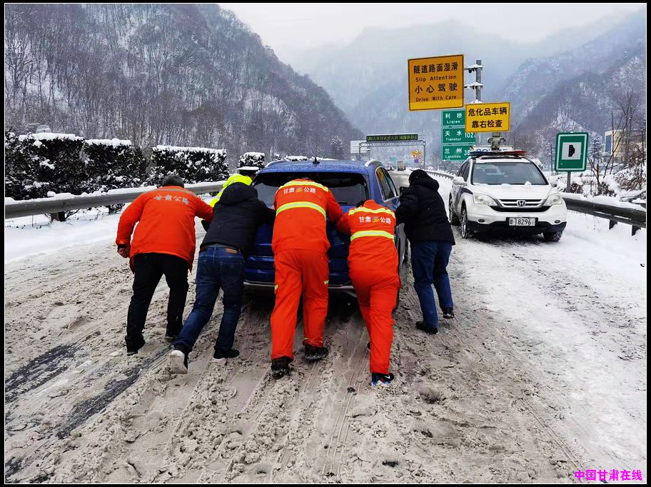 G30线连霍高速宝天段上行线K1287至麦积山特长隧道进口,路面积雪厚度达10公分。由于积雪太厚,造成上行线K1286至K1290桃花坪段陕西进入天水的车辆通行困难。天水公路事业发展中心高速公路养护所一方面利用除雪车铲雪推雪,融雪剂撒布车撒铺融雪剂,清开一条雪路;一方面疏导交通,全力救助被困车辆。被困的挂车打滑,基本都无法起步,养护职工一铲一铲的清理掉轮胎底下和周围的冰雪,指挥司机缓慢起步,脱困前进。被困的小车打滑,养护职工推车让它起步前进,并告诉他们谨慎驾驶、减速慢行。
