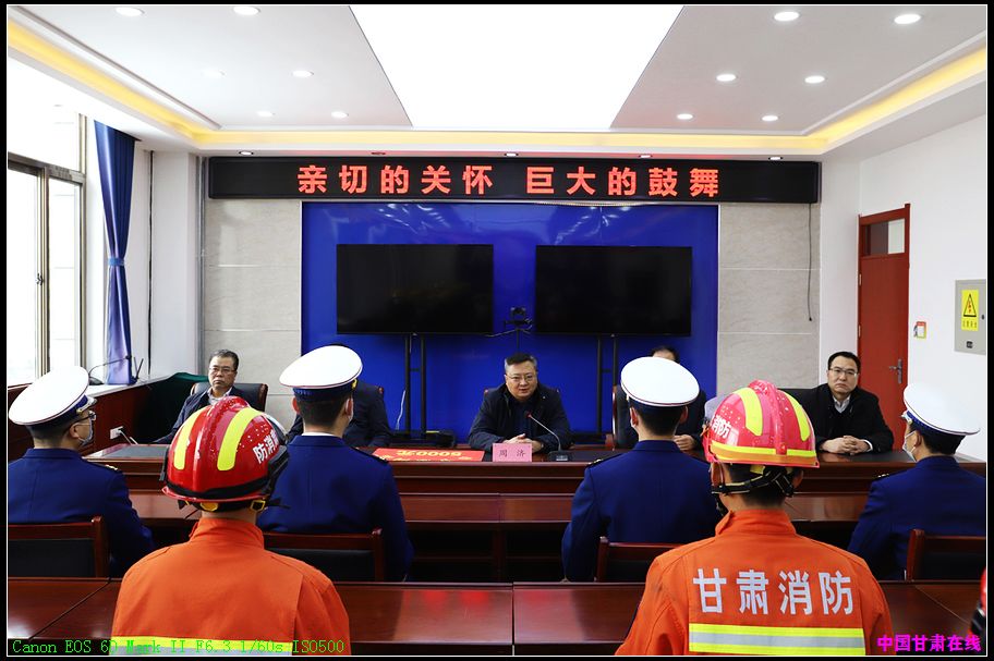 周济一行到队后,对大队春节期间的执勤战备安排、队伍管理等工作进行了详细询问了解,并代秦安县委、县政府向奋战在一线的消防救援人员送来亲切的关怀和诚挚的祝福,同时召开了座谈会。