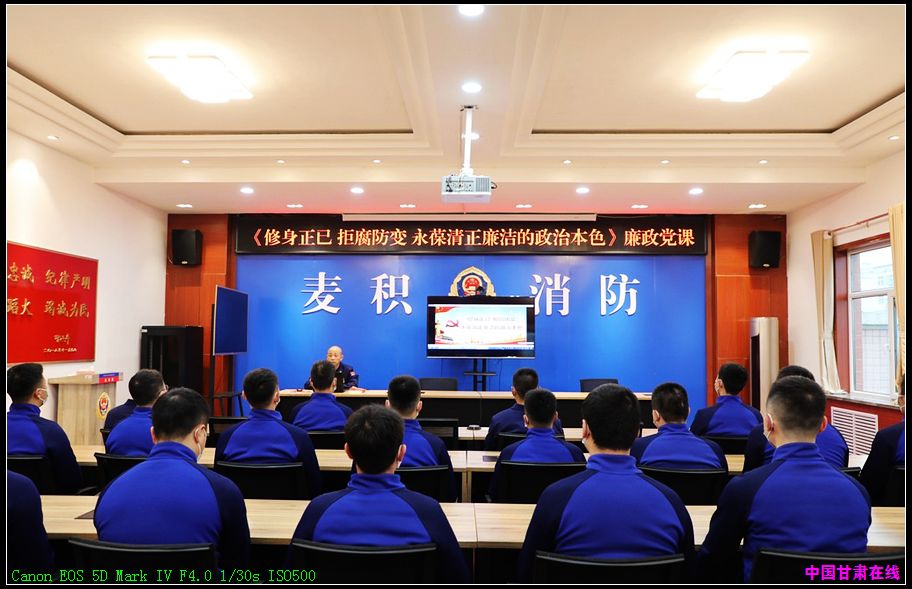中国甘肃在线麦积讯 为进一步加强党风廉政建设工作,持之以恒整风肃纪,维护队伍安全稳定,2月17日,麦积消防大队组织开展《修身正己拒腐防变 永葆清正廉洁的政治本色》专题廉政党课,会议由政治教导员伏小伟主持,大队、站全体人员参加。