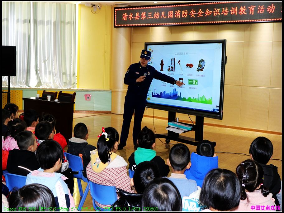 中国甘肃在线清水讯 为确保“两会”期间消防安全环境持续稳定,进一步提高学校师生的安全意识和自防自救能力,形成“教育孩子,带动家庭,影响社会”的良好效应,近日,天水市清水县消防救援大队走进辖区第三幼儿园给小朋友们上了一堂独具一格的消防安全课,100余名小朋友在消防老师的带领下来体验消防,“零距离”学习消防。