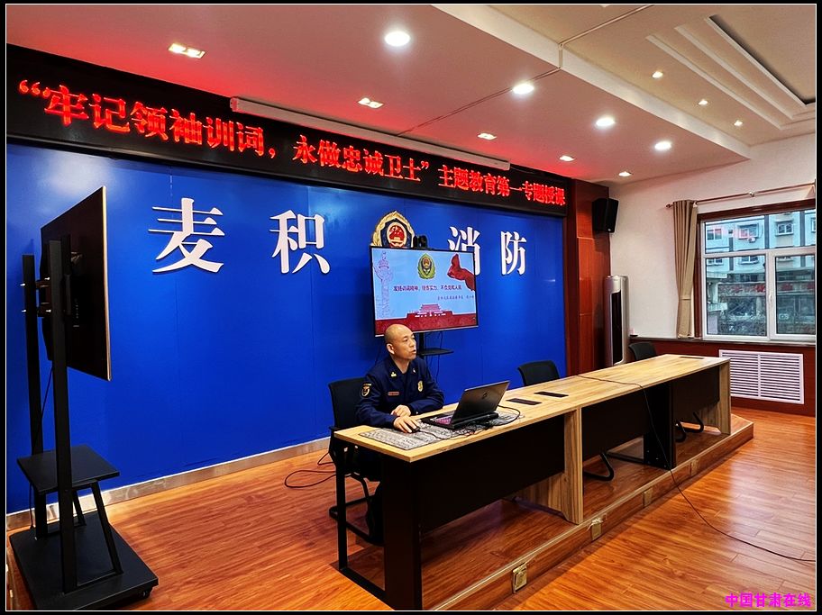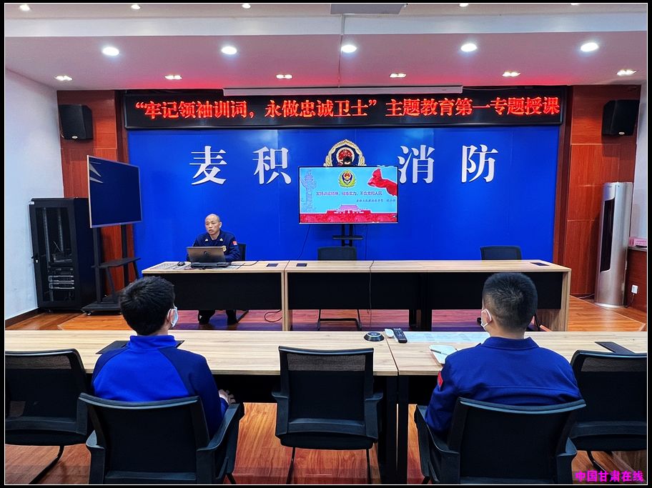 中国甘肃在线麦积讯 为深入学习贯彻习近平总书记重要训词精神,教育引导消防救援人员永葆忠诚政治本色,积极担当作为,奋力推动全区消防救援事业高质量发展。近日,麦积大队组织开展“喜迎二十大,全力保平安”深化“牢记领袖训词,永做忠诚卫士”主题教育专题授课,政治教导员伏小伟以《发扬训词精神,锤炼实力,不负党和人民》为题,为大队在队人员讲授专题党课。