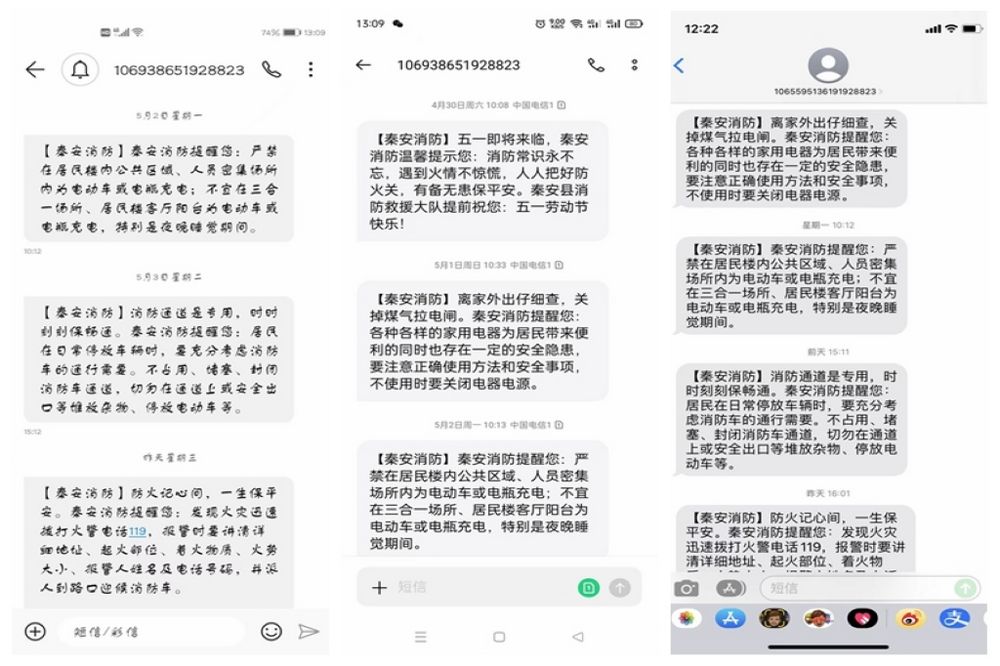同时大队积极向重点人员发送消防安全提示短信,短信内容针对“五一”假期大型活动多、人员相对密集等特点,着重围绕安全用火用电用气、电动车停放和充电、初起火灾处置、探亲访友、外出游玩、行车安全等多个环节进行提醒提示。通过协调辖区户外大屏、楼宇电视等媒介,高频次播放消防安全公益广告,广泛普及与辖区群众生活息息相关的家庭防灭火、疏散逃生、电气火灾预防等消防安全常识,让更多的群众知晓防火的重要性和必要性,不断扩大消防宣传覆盖面。