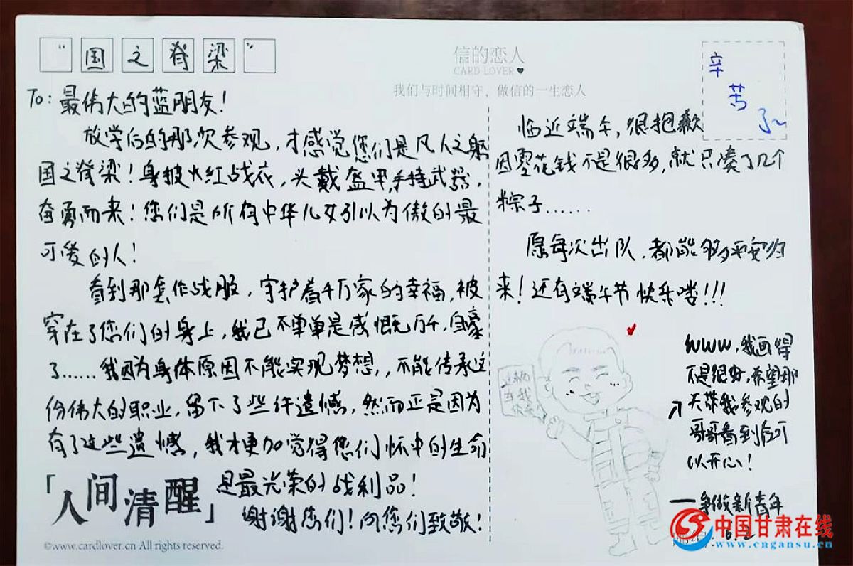 她说每个节假日,都能看到消防员坚持在一线岗位上,守护着我们的平安,工作非常辛苦,端午节将至,送来香糯可口的粽子和糖果对消防员的辛勤工作表示感谢。小姑娘非常用心的在每一份糖果上都写下了“辛苦了”的便条,还留下了一张贺卡,贺卡上写满了祝福,这些小细节让每一位消防员都深受感动。消防员同时也邀请这名学生到站里参观,消防员带领着她参观了宿舍,车库,消防文化墙等,让学生近距离感受消防员日常的生活、学习和训练,最后也为该同学赠送了消防纪念品,鼓励她好好学习,学有所成,为祖国发展贡献自己的力量。