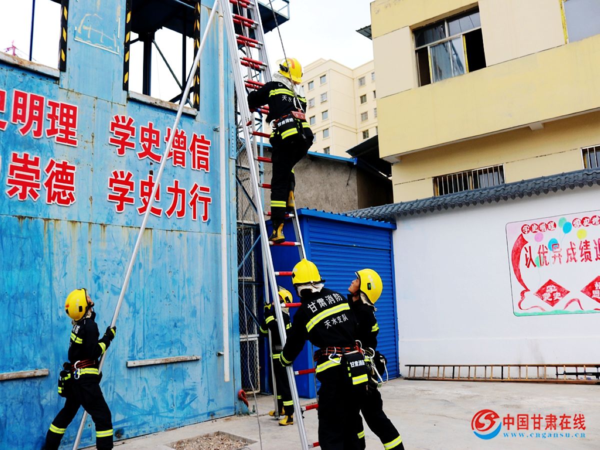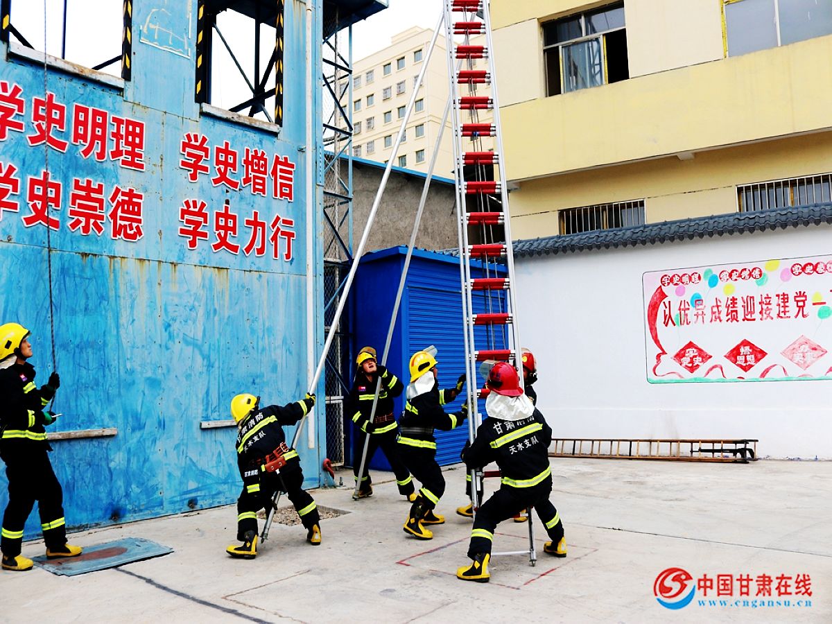 中国甘肃在线清水讯 为深入推进全员岗位大练兵工作,提升队伍灭火救援攻坚打赢能力,巩固提升消防救援人员班组科目训练水平。近日,天水市清水县消防救援大队开展攀登15米金属拉梯操法训练。
