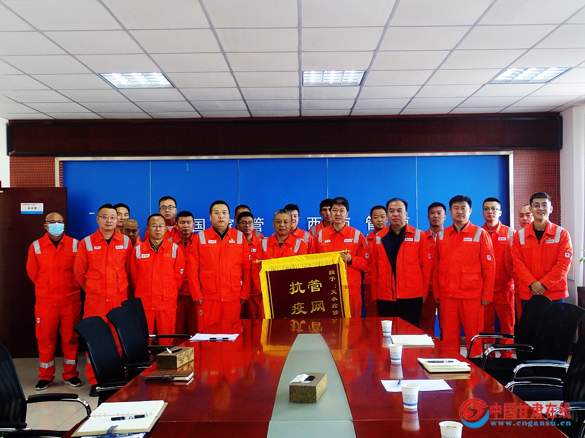 中国甘肃在线天水讯(通讯员周杰斌) 10月19日,天水分公司经理郝克军、党委书记王学斌、副经理石磊等一行到天水抢修中心调研,并将一面绣有“管网铁军 抗疫先锋”的锦旗授予天水抢修中心,表达了对9月20日在中贵线K159处B型套筒焊接修复突遇疫情的全体人员,他们在抗击疫情期间,义无反顾坚守防疫一线的无私无畏、甘愿付出和全力配合防疫工作的感谢之情。
