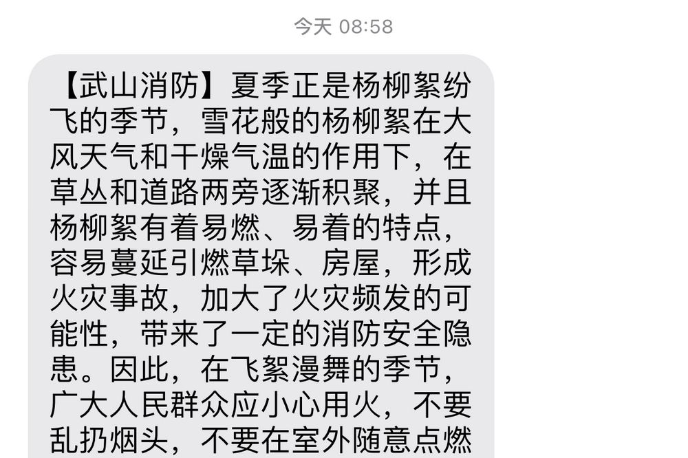 每年四、五月份,是杨柳絮飘飞的高峰期,无孔不入的柳絮、杨絮着实给群众的出行和健康带来影响,杨柳絮不仅是春夏主要的过敏源之一,还是最“嚣张”的“引火犯”,杨絮纷飞的时节,除了要注意避免感染呼吸道、过敏等疾病,还要注重预防火。连日来,武山县消防救援大队开展杨柳絮防火宣传活动,全面加强杨柳絮火灾防控工作,最大限度减少火灾危害。
