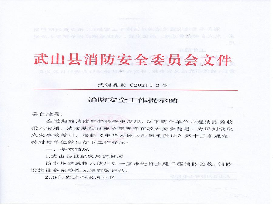 • 武山县消防救援大队安全委员会向住建部门下发《消防安全工作提示函》