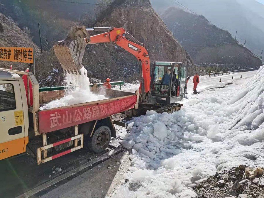近日,天气骤冷,极易出现结冰现象。武山公路段巡路人员在S225线三锁路巡查时发现一常年流水处(K290+650)出现结冰,致使边沟堵塞路面结冰,给过往车辆通行带来一定的安全隐患。该段立即组织人员及机械上路打冰防滑,保障了过往车辆的通行安全。