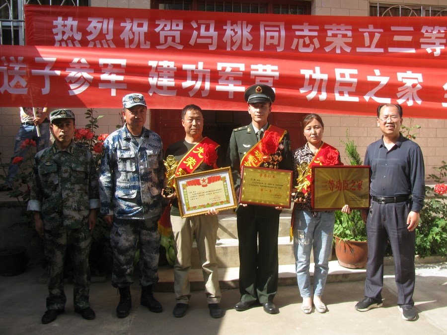 5月22日,天水市麦积区人武部、中国人民解放军69315部队、区退役军人局,元龙镇领导一行为元龙镇冯川村籍战士在部队荣立三等功臣的冯桃家中送去了立功喜报。冯桃,男,94年7月出生,中共党员,汉族系天水市麦积区元龙镇冯川村籍战士,于2011年