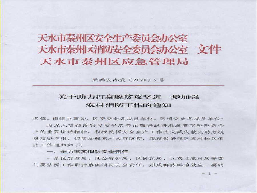 • 天水市秦州区联合发文部署《关于助力打赢脱贫攻坚进一步加强农村消防工作的通知》
