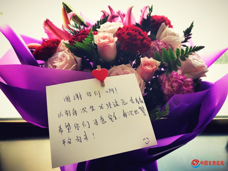 5月21日下午,一捆包有百合和红玫瑰的鲜花,让七里墩中队的全体消防员感到深深的温暖。花卡上写着:“谢谢你们啊!以前每次坐26路经过总会看看,希望你们注意安全,每次出警平安归来!”中队队员得知有群众送来鲜花后