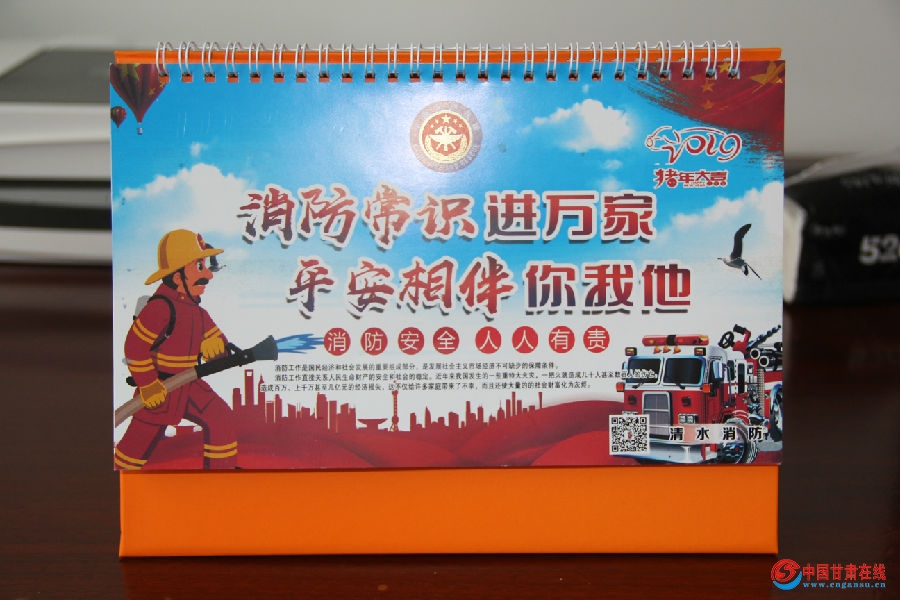 为切实做好冬季消防安全工作,全方面加强消防宣传力度,提高辖区群众的消防安全意识。近日,清水消防大队经过精心设计,专门印制了1000份2019年消防宣传台历,作为特殊新年礼物陆续向辖区消防安全重点单位、社区居民