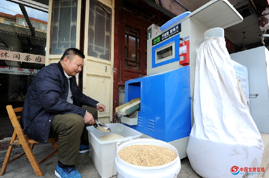 11月21日,麦积区桥南仿古街店主李天龙正在现磨大米。这是来自黑龙江的优质带壳稻谷,经过现场脱壳碾磨、销售,深受消费者的青睐。据了解,店内销售的大米价格基本都在四五元一斤,和其它袋装销售的东北米相比,省去