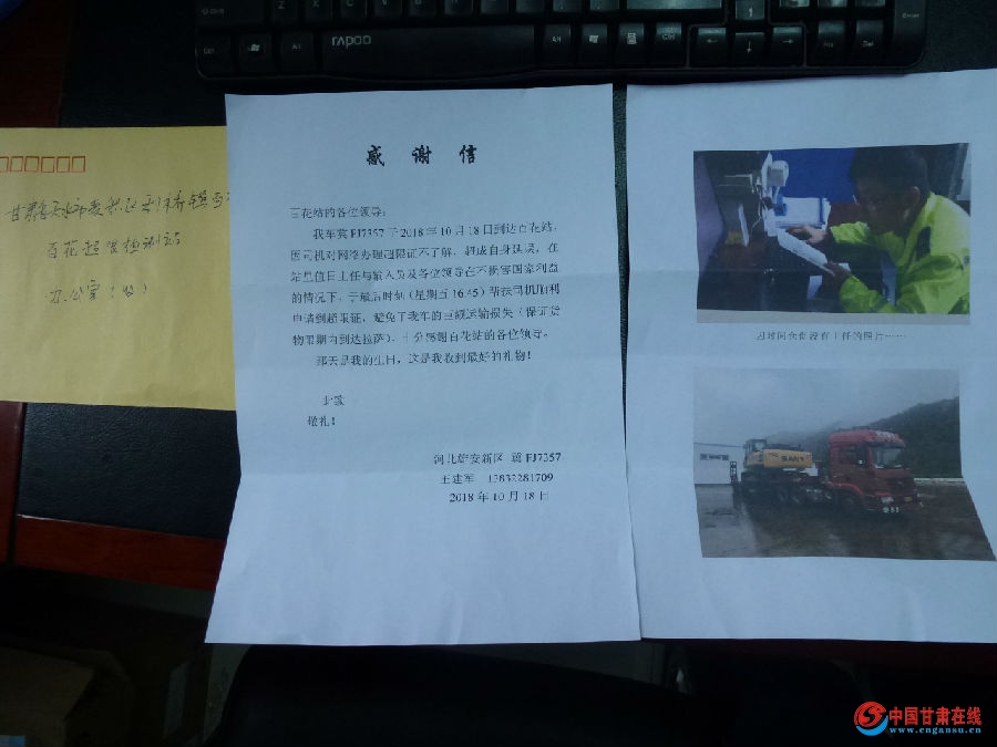 “感谢百花超限检测站的干部职工对我的热情服务,让我顺利办完审批手续,避免重大经济损失”!11月14日下午,百花超限检测站收到一封从河北寄来的感谢信和锦旗,上书“公务有情,心中有爱”。这封感谢信是来自10月份