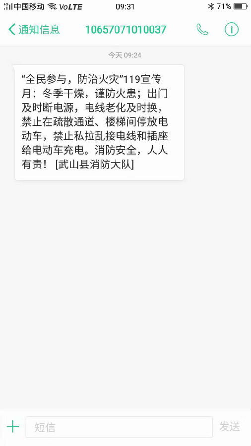 为切实做好119消防宣传月期间消防安全宣传工作,进一步提高全民消防安全意识,11月9日,武山消防大队利用手机短信平台,向全县移动手机用户发送消防宣传短信。 “全民参与,防治火灾”119宣传月:冬季干燥,谨防