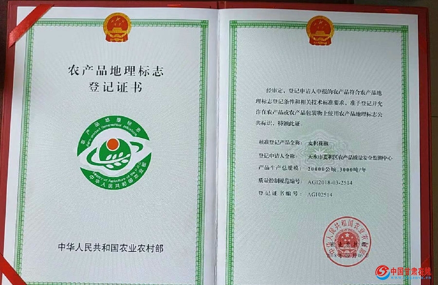 2018年6月1日,农业农村部中国绿色食品发展中心召开了2018年第一批农产品地理标志登记认证评审会。“麦积花椒”评审工作顺利通过了农业农村部专家的最终评审予以公示,“麦积花椒”产品符合《农产品地理标志管理办法