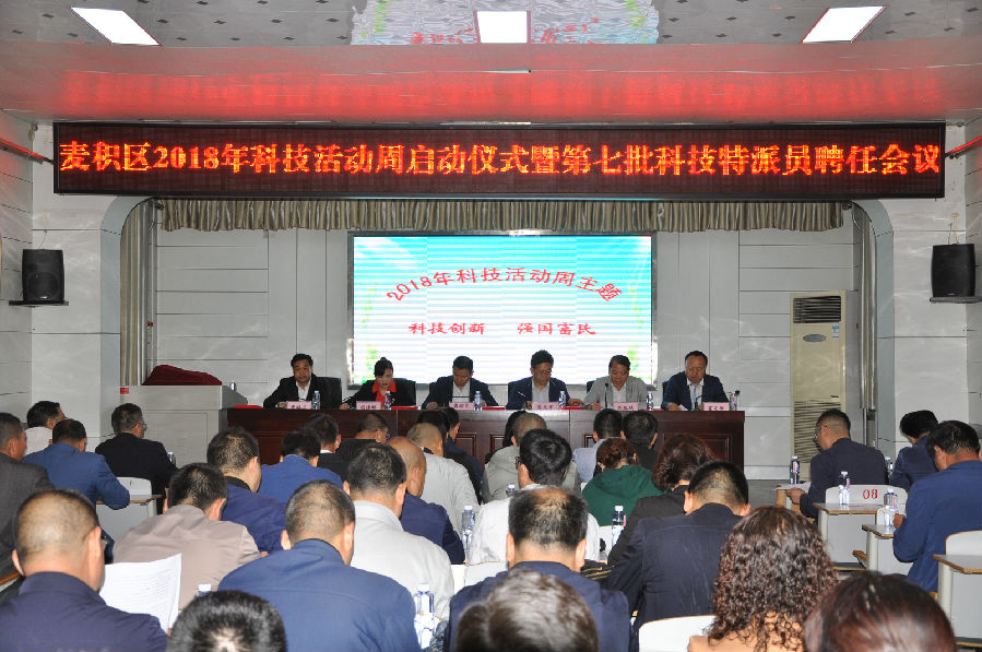 中国甘肃在线天水讯:天水市麦积记者站 李凤旗5月19日上午,天水市麦积区2018年科技活动周启动仪式暨第七批科技特派员聘任会议在区委党校举行。会议由区人大副主任窦顺良主持、副区长陈兆亭、区政协副主席胡桂琳及