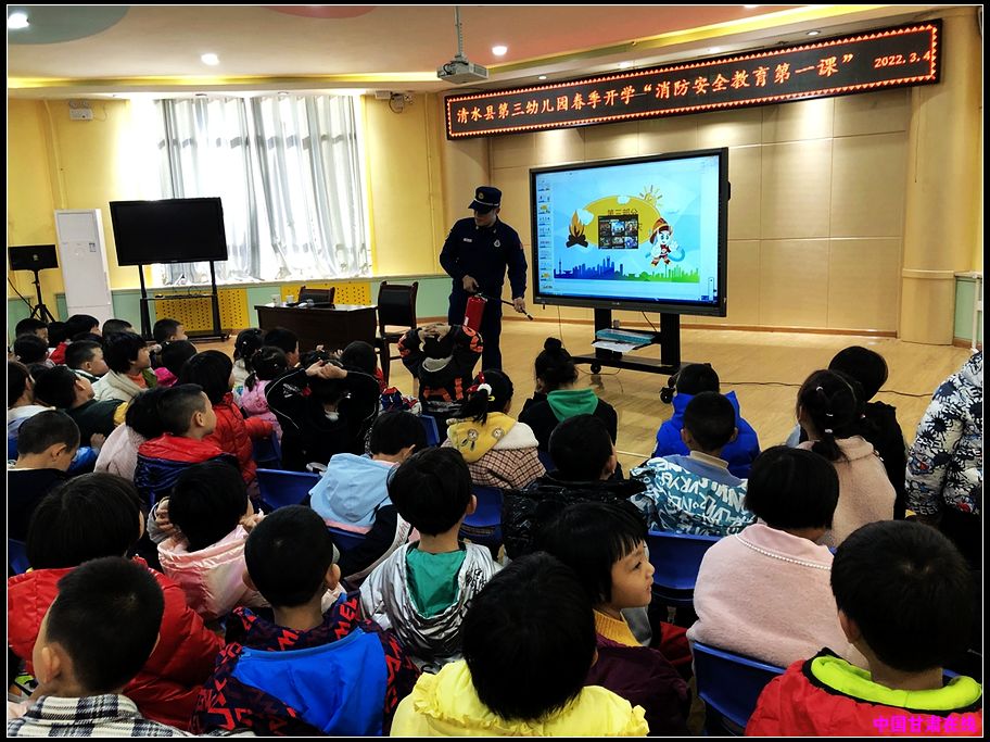 中国甘肃在线清水讯 为确保“两会”期间消防安全环境持续稳定,进一步提高学校师生的安全意识和自防自救能力,形成“教育孩子,带动家庭,影响社会”的良好效应,近日,天水市清水县消防救援大队走进辖区第三幼儿园给小朋友们上了一堂独具一格的消防安全课,