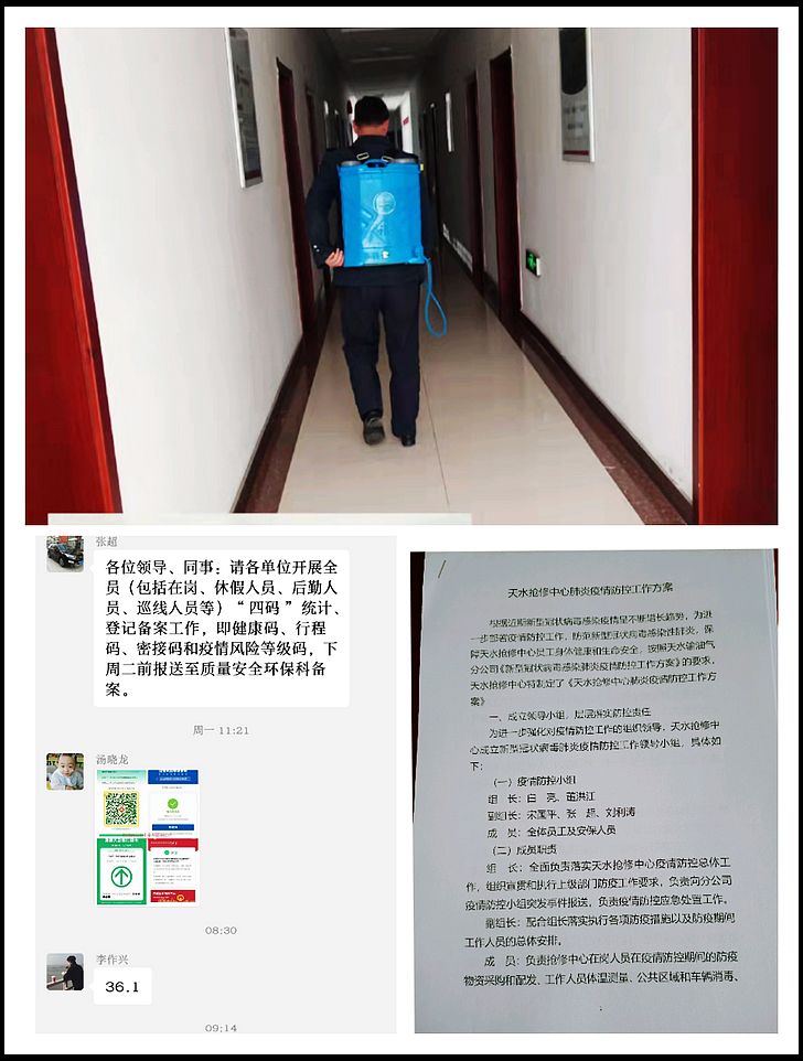 (甘肃卫健委发布:11月2日0时至24时,甘肃省新增本土确诊病例14例。其中,兰州市1例,天水市13例。)疫情防控形势严峻,11月3日,天水抢修中心按照分公司情防控紧急视频会议精神,第一时间为员工传达疫情防控精神并落实相关工作,筑牢疫情管控